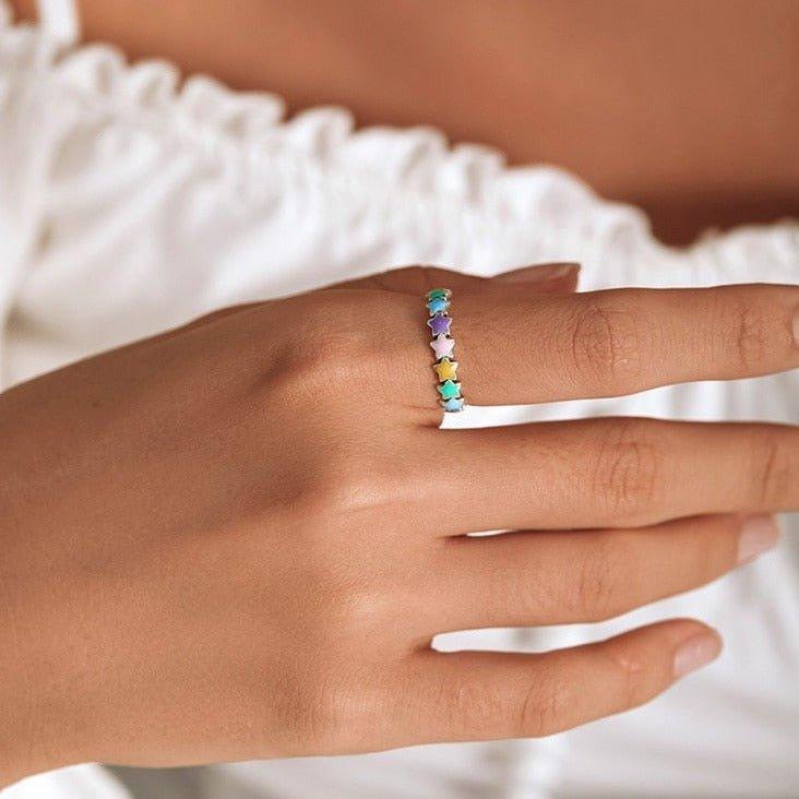 Anel Prata Estrelas Coloridas Rainbow