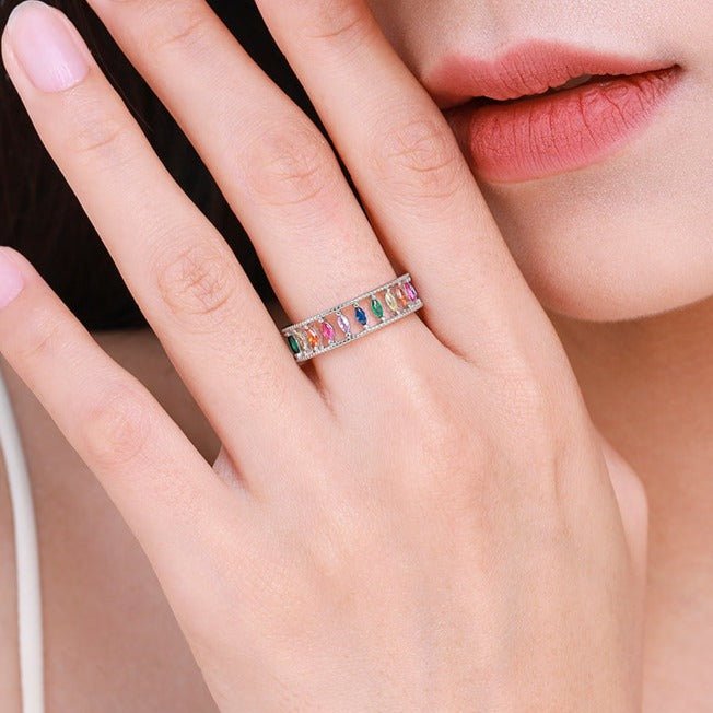 Nosso Anel Navete de Zircônias Coloridas em Prata 925 conta com um design exclusivo e com cada detalhe pensado para completar e trazer mais beleza ao estilo de cada mulher. Prezamos pela alta qualidade das joias, utilizando os melhores materiais, livres de níquel, chumbo e todos hipoalergênicos.