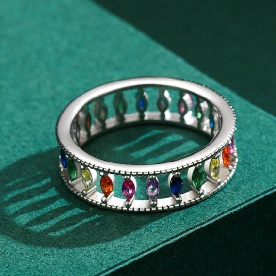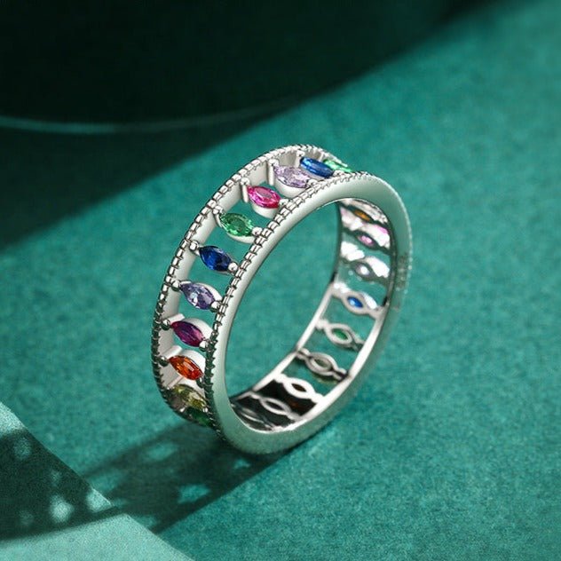 ANEL NAVETE DE ZIRCÔNIAS COLORIDAS EM PRATA 925