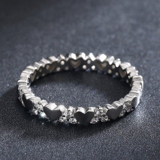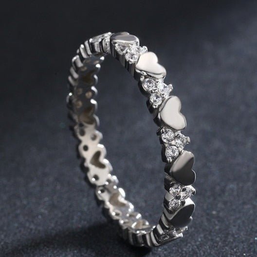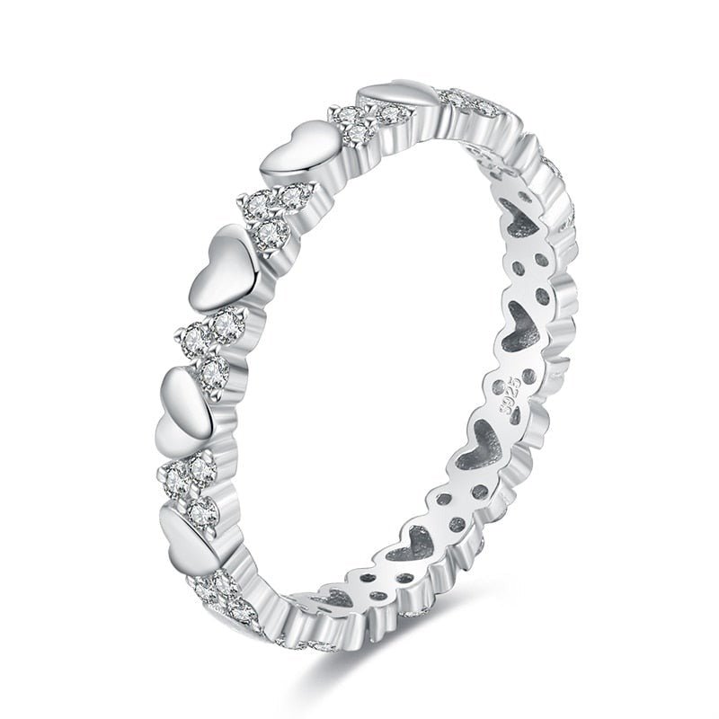 Nosso Anel Sequência de Corações e Zircônias em Prata 925 conta com um design exclusivo e com cada detalhe pensado para completar e trazer mais beleza ao estilo de cada mulher. Prezamos pela alta qualidade das joias, utilizando os melhores materiais, livres de níquel, chumbo e todos hipoalergênicos.