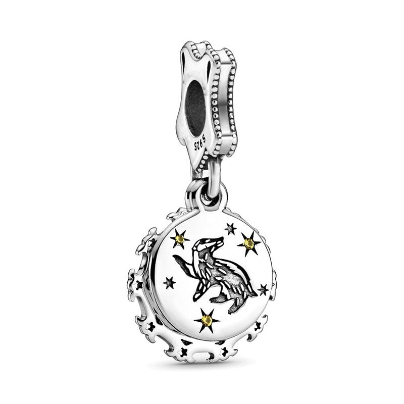 Berloque tipo pingente no formato de brasão da casa Lufa Lufa da saga Harry Potter, em Prata 925 (prata fina) compatível com as principais marcas de pulseiras do mercado.
