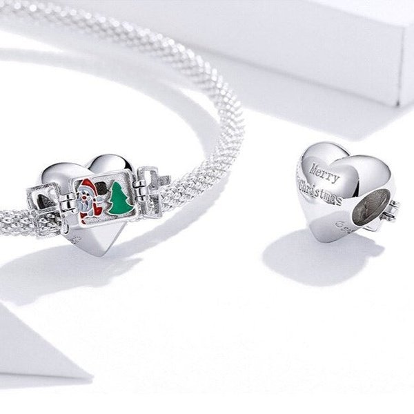 Berloque de Natal Coração Janela com Papai Noel e Árvore Prata