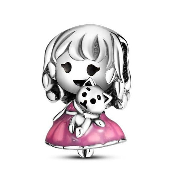 Berloque tipo pingente no formato de menina de vestido rosa com gatinho, em Prata 925 (prata fina) compatível com pulseiras Pandora, Life Vivara e demais pulseiras no mercado.