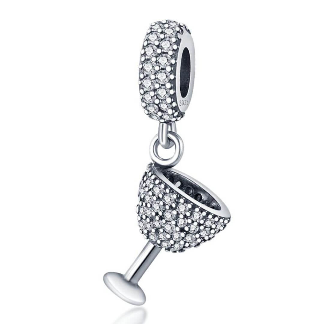 Berloque tipo pingente no formato de taça de gim com zircônias, em Prata 925 (prata fina) compatível com pulseiras Pandora, Life Vivara e demais pulseira no mercado.