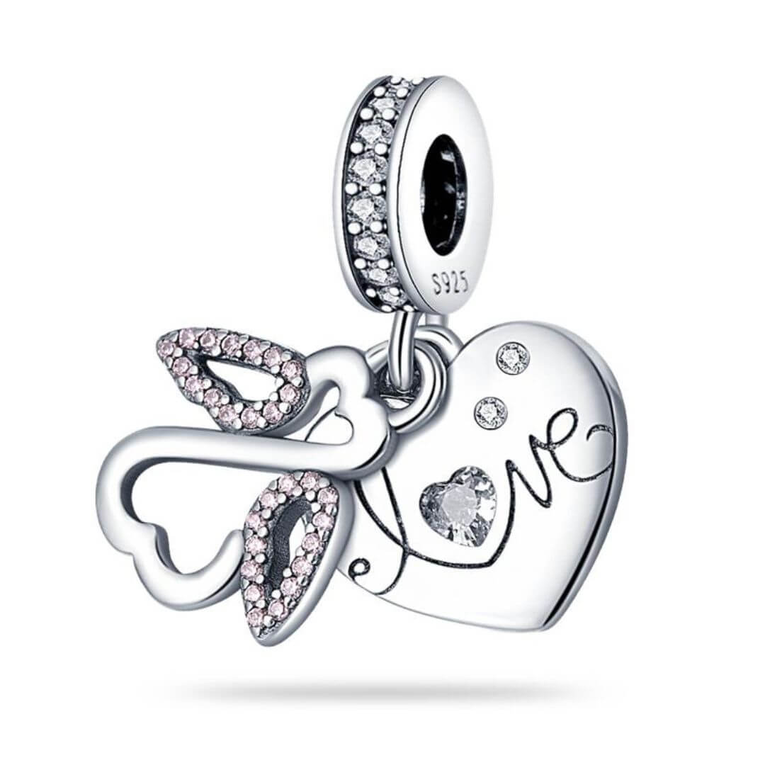 Berloque tipo pingente no formato de coração e símbolo do infinito, em Prata 925 (prata fina) compatível com pulseiras Pandora, Life Vivara e demais pulseiras no mercado.
