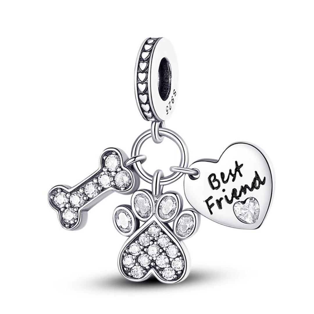 Berloque tipo pingente no formato de pata e osso de cachorro. Berloque em Prata 925 (prata fina) compatível com pulseiras Pandora ou Life Vivara e demais pulseiras no mercado.