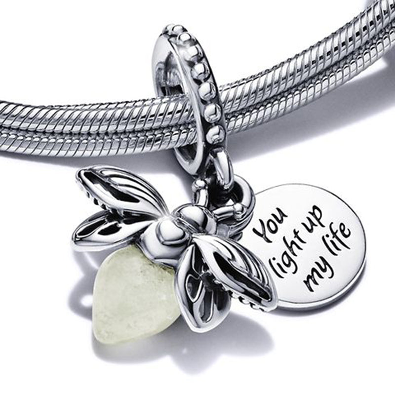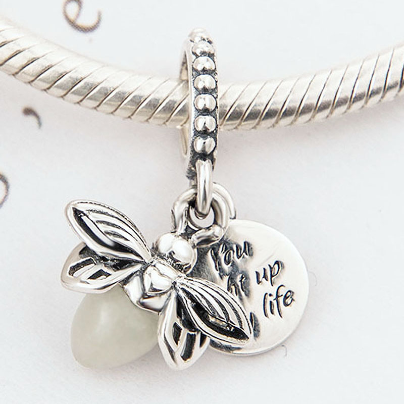 Berloque tipo pingente no formato de vagalume que brilha no escuro, em Prata 925 (prata fina) compatível com pulseiras Pandora, Life Vivara e demais pulseiras no mercado.