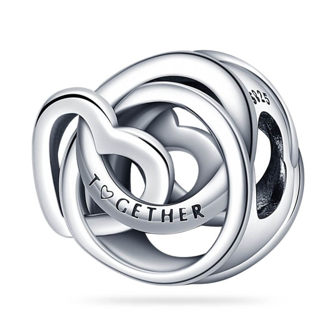 Berloque tipo separador no formato de corações entrelaçados escrito together, em Prata 925 (prata fina) pulseiras compatíveis Pandora, Life Vivara e demais pulseiras no mercado.